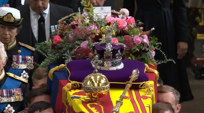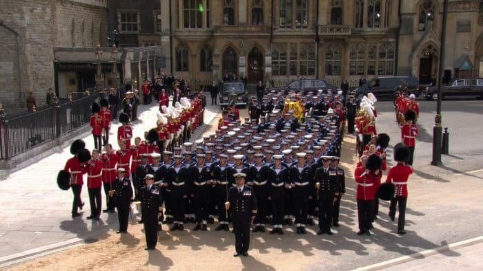 - 11:44 uur: de kist wordt verplaatst van Westminster Hall naar Westminster Abbey. De baar wordt getrokken op een affuit, getrokken door 142 marinemensen. De kist wordt gevolgd door senior members van de familie, inclusief Z.M. Koning Charles III, de Prins van Wales en Prins Harry.
