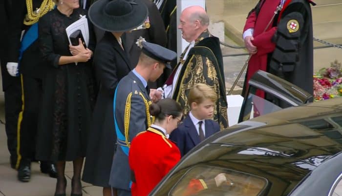 11:40 uur: Prins George en Prinses Charlotte reden samen met de Queen Consort en de Princess of Wales. De Hertogin van Wessex rijdt samen met de Hertogin van Sussex. De andere kleinkinderen arriveerden in de kerk.