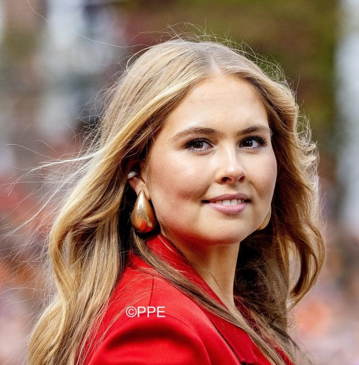 Amalia droeg opvallende grote goudkleurige oorhangers. Maar, is het je opgevallen dat ze gisteren ook haar earcuff droeg? De goudkleurige druppelvormige oorhangers hebben we eerder gezien bij Amalia. Er wordt op internet Franky Amsterdam genoemd, maar ze kunnen net zo goed van Bailey Amsterdam of van nog een ander label komen. Internet staat er behoorlijk vol mee.