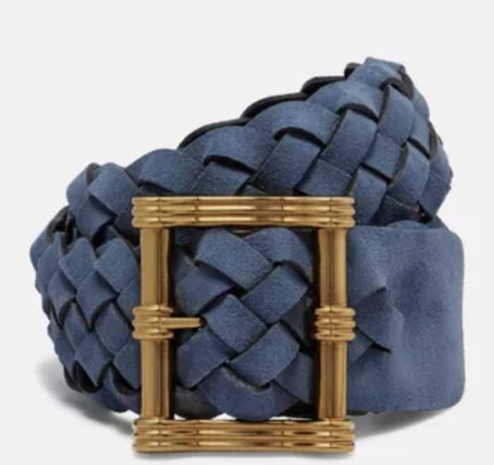 Prinses Aimée’s donkerblauwe suède gevlochten riem is afkomstig van Etro.