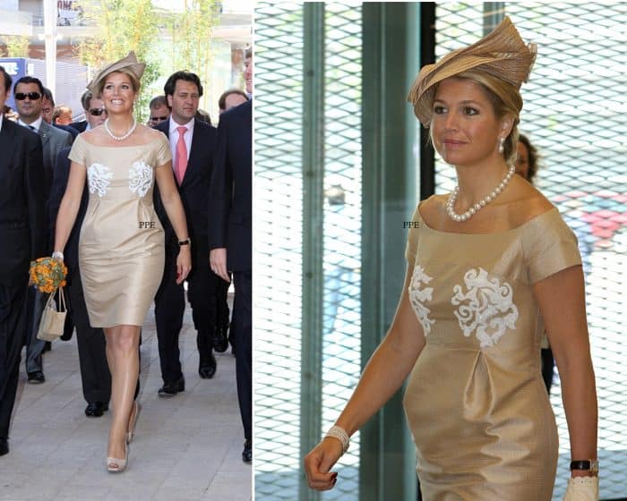 Oef wat een vreselijke jurk. Valt ook niet mooi op de schouders. En Maxima was toen echt niet zwanger, ook al lijkt het zo. Die applicaties op de borsten, lijkt net of deze dingen moeten verhullen dat de draagster soms lekkende borsten heeft vanwege het geven van borstvoeding 🫣.