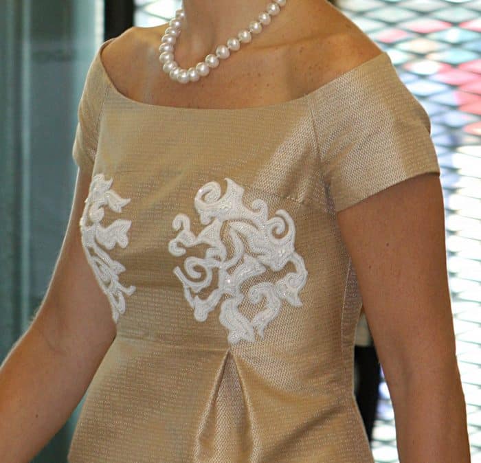Maar wat ik vandaag op de plank heb liggen? Dat is toch wel van een heel andere orde. Meestal is het de bedoeling dat een jurk de vrouwelijke vormen subtiel omlijst, maar Edouard Vermeulen dacht daar bij de jurk van vandaag heel anders over. Op Máxima’s boezem prijken twee grote, spierwitte guirlandes. Een gemiddelde kerstkrans zou er jaloers op zijn. Wat verder opvalt aan de jurk is de elegante boothals en de kenmerkende Natan-plooi op heuphoogte. Bij de debuut in 2008 liepen de meningen over het ontwerp sterk uiteen.