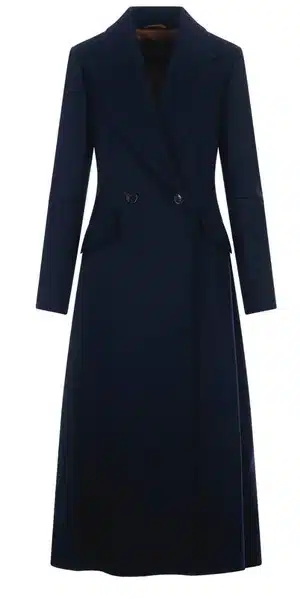 Prachtige A lijn jas. Dit model flatteert, wat je niet kunt zeggen van het jaren 20 hobbezak model van de vrouw rechts. De hele outfit in donkerblauw vind ik mooi. Lekker warme tweed voor de kou daar. De hoofdband maakt haar koninklijk.