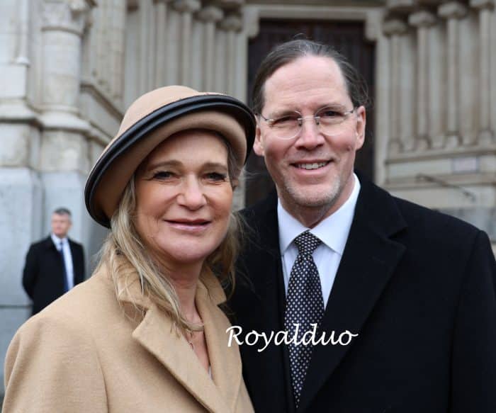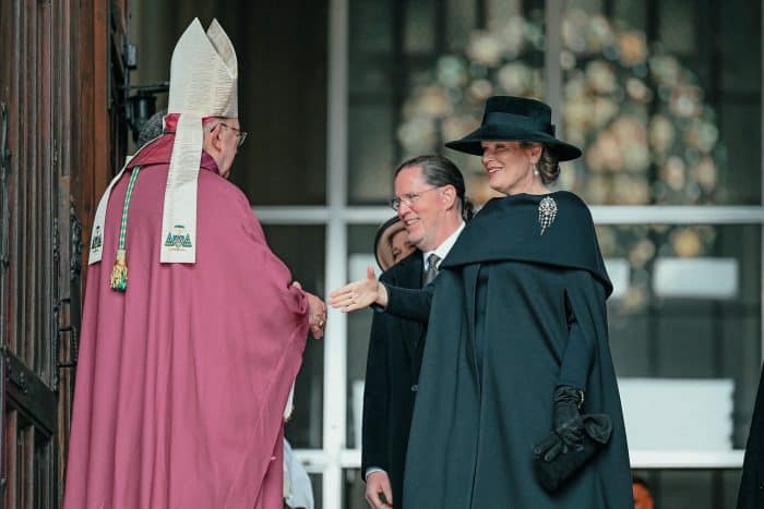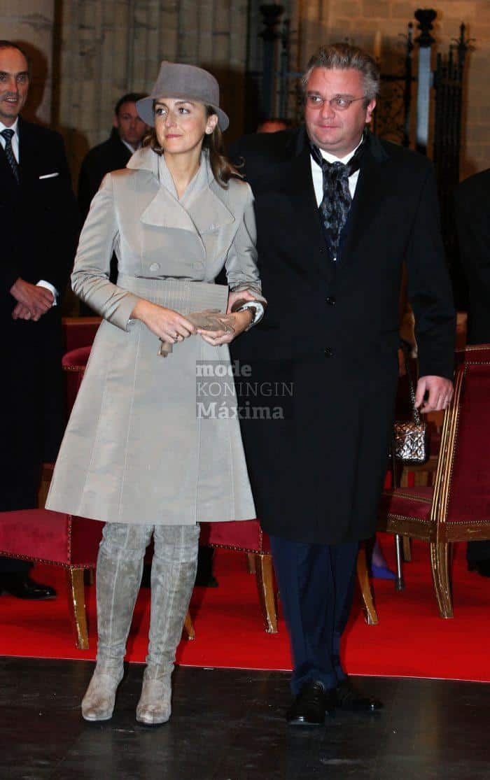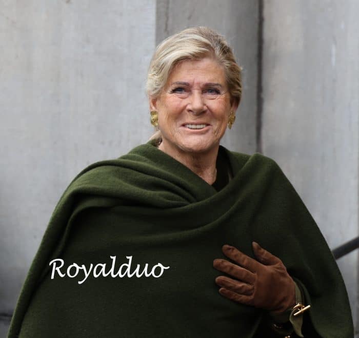Prinses Delphine was, zoals gebruikelijk, het meest opvallend gekleed. Ze droeg een zwarte pantalon met een camelkleurige mantel. Het hoedje, dat er perfect bij past, is afkomstig van Elvis Pompilio. Tot slot droeg ze – het opvallendst aan haar outfit – kleurrijke enkellaarsjes met bloemen van Socofy. Overigens, ik zie achter Delphine ook prinses Margaretha van Luxemburg, samen met haar man prins Nikolaus naast haar. Margaretha en haar broer Guillaume zijn nicht en neef van koning Filip.