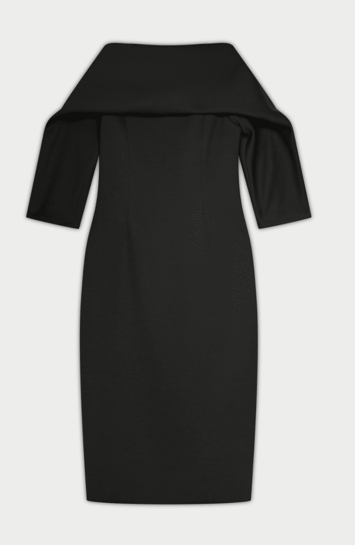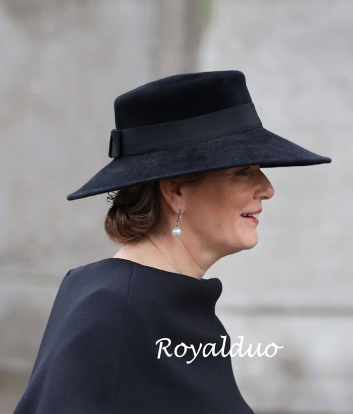 Koningin Mathilde droeg vandaag een zwarte jurk met grote kraag, met het idee van een kleine stola (ontwerp: Modehuis Natan). Daarbij droeg ze een zwarte cape. De hoed, die al eerder in beeld kwam, is afkomstig van hoedenontwerpster Fabienne Delvigne. Qua juwelen zien we Mathilde met de watervalbroche. Ook haar clutch en pumps zijn afkomstig van Modehuis Natan.