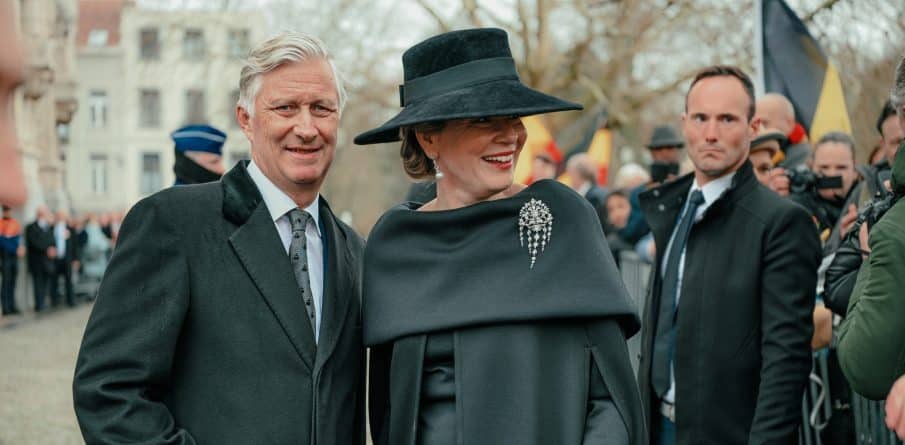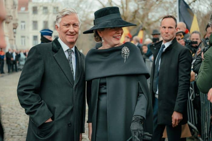 Koningin Mathilde droeg vandaag een zwarte jurk met grote kraag, met het idee van een kleine stola (ontwerp: Modehuis Natan). Daarbij droeg ze een zwarte cape. De hoed, die al eerder in beeld kwam, is afkomstig van hoedenontwerpster Fabienne Delvigne. Qua juwelen zien we Mathilde met de watervalbroche. Ook haar clutch en pumps zijn afkomstig van Modehuis Natan.