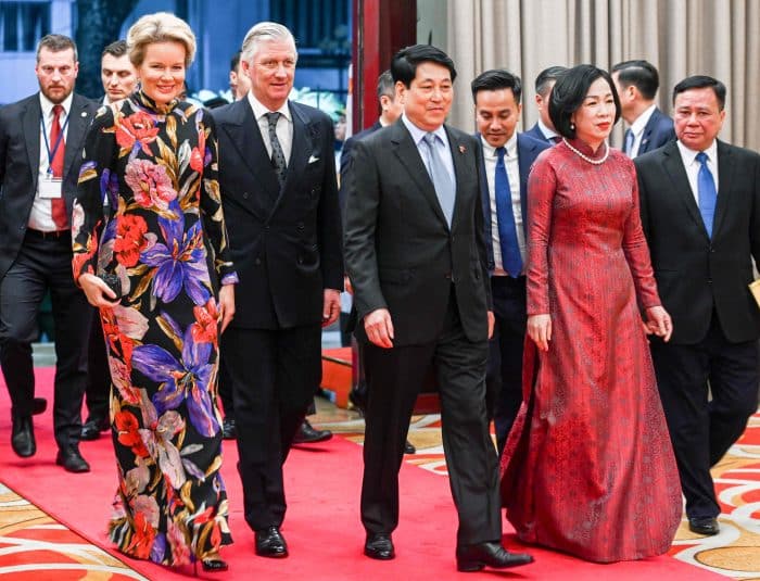 Voor het staatsbanket in Vietnam stopte koningin Mathilde een moderne bloemenjurk van Dries van Noten in haar koffer.