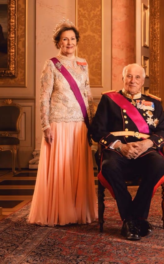 Koningin Sonja heeft deze keer een voor haar doen bescheiden kleur galajapon gekozen. bestaand uit een zalmroze rokgedeelte met een zilvergrijze kanten top. Qua juwelen draagt ze onder andere koningin Mauds parel- en diamanten tiara.
