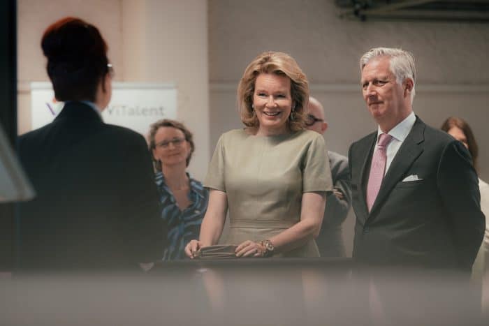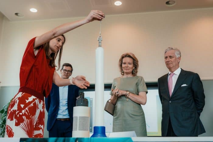 Koning Filip en koningin Mathilde bezochten het Wetenschapspark in Niel, waarbij Mathilde koos voor een zomerse look in saliegroen.