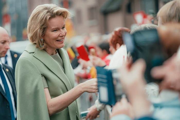 Mathilde koos gisteren voor een zomerse look: een jurk met korte mouwen, in de kleur saliegroen. Daarbij droeg ze een capemantel in dezelfde kleur. Zowel de mantel als de jurk zijn afkomstig van Modehuis Natan. Saliegroen is een trendkleur van vorige jaren, die langzaamaan uit het modebeeld aan het verdwijnen is. Toch is dit nog steeds een mooie zachte kleur voor het voorjaar en de zomer. Mathilde droeg de set eerder in 2023, 2024 en 2025. Fijn dat het ook nu weer terugkwam.