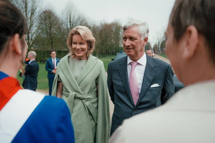 Mathilde koos gisteren voor een zomerse look: een jurk met korte mouwen, in de kleur saliegroen. Daarbij droeg ze een capemantel in dezelfde kleur. Zowel de mantel als de jurk zijn afkomstig van Modehuis Natan. Saliegroen is een trendkleur van vorige jaren, die langzaamaan uit het modebeeld aan het verdwijnen is. Toch is dit nog steeds een mooie zachte kleur voor het voorjaar en de zomer. Mathilde droeg de set eerder in 2023, 2024 en 2025. Fijn dat het ook nu weer terugkwam.