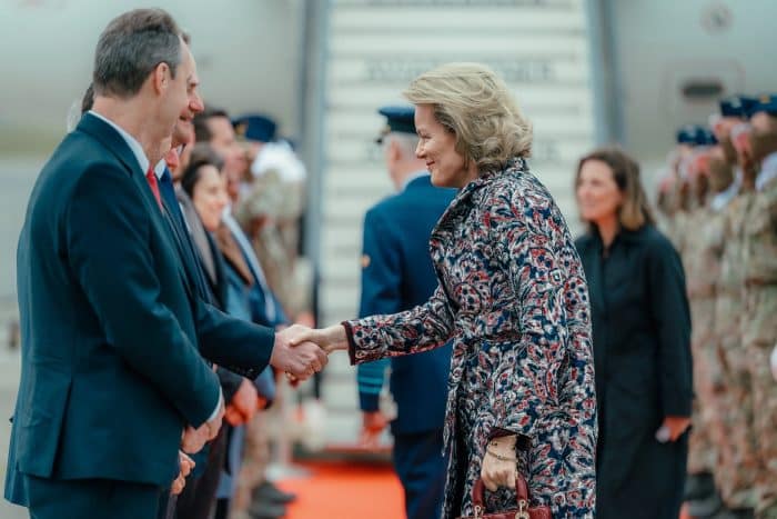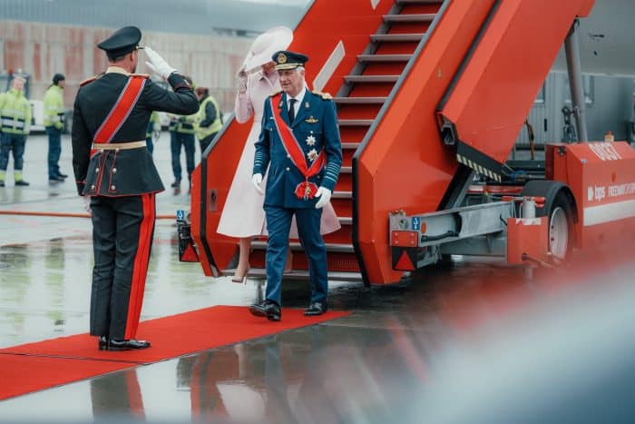 Bij het vertrek vanaf het vliegveld Melsbroek vond vanochtend een officiële vertrekceremonie plaats. Hier zagen we koningin Mathilde in haar jacquard mantel van Modehuis Natan, op een wijnrode broek en een wijnrode top, eveneens afkomstig van Natan. Koning Filip draagt zijn uniform. In eigen land doet hij dit niet altijd, maar in Noorwegen is het dragen van een uniform wel gebruikelijk tijdens een staatsbezoek.