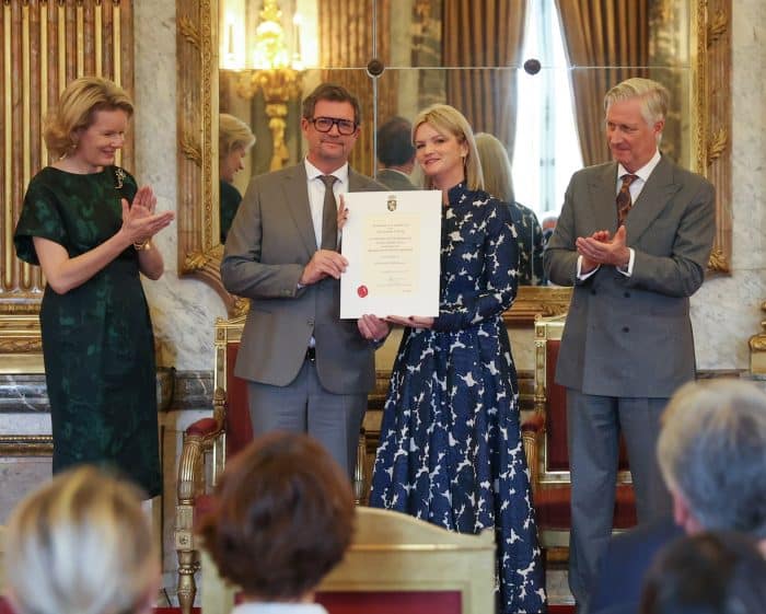 Koningin Mathilde komt alvast een beetje in kerstsferen. Zo ontving Mathilde de nieuwe hofleveranciers in kerstig donkergroen. Vandaag verscheen ze in een heel andere kleur: lila!