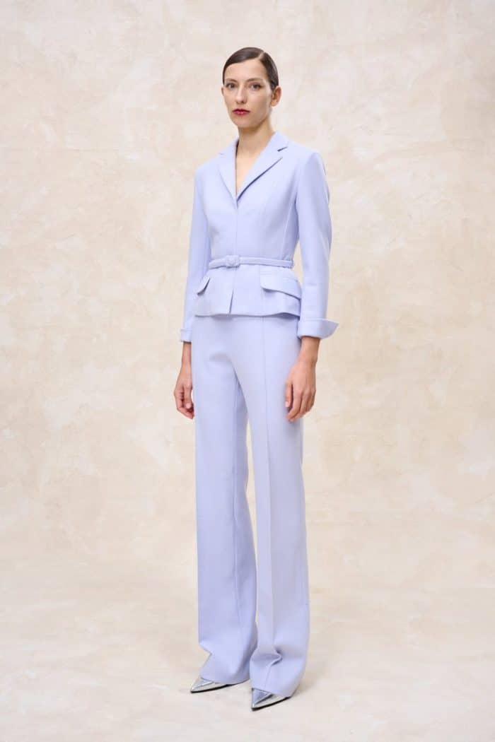 Groene jurk oogt vreemd. Rare vlekken en slechte pasvorm. De mouwen zijn te ruim en te kort en de taille is te hoog. En dan de vreemde vouwen vooraan. Lichtpaars broekpak is mooi, toch iets anders dan de business modellen. En kleur staat Mathilde ook goed.