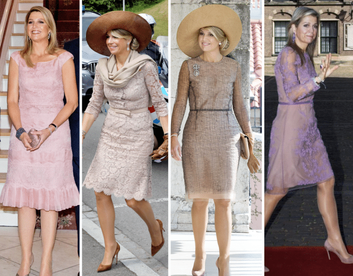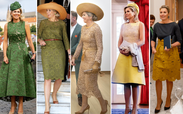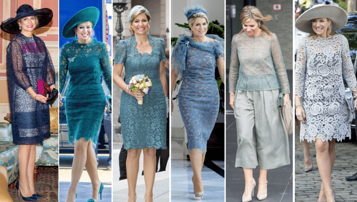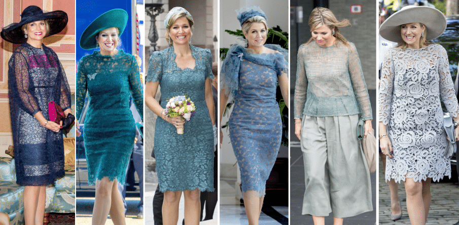 Wat opvalt is Máxima’s zwak voor moderne, originele vormen van kant. Gehaakt kant, spinnenragkant of een grove guipure.