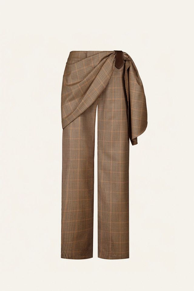 De hippe ruitbroek met een draperie op de heup komt van Johanna Ortiz, de coltrui is een oudje van Max Mara.