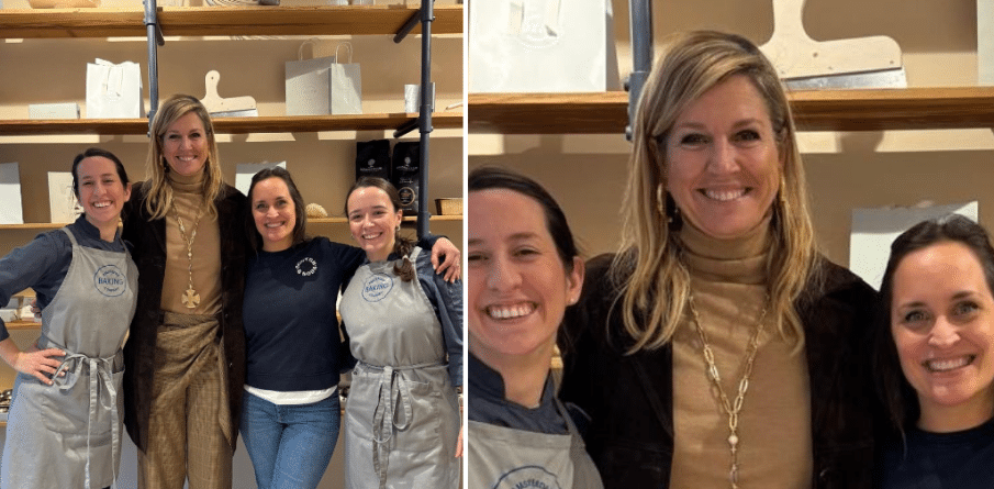 De Amsterdam Baking Company wordt gerund door Nina en Marisol, twee dames met een Argentijnse achtergrond. Hun doel is om de zoete smaken van de Argentijnse pattiserie naar de Nederlandse woonkamers te brengen. Alfajores zijn hun specialiteit en laat dat nu net Máxima’s lievelingskoekje zijn! Bij binnenkomst werd de koningin gelijk herkend, zo vertellen Nina en Marisol op hun Instagrampagina. Máxima verzocht expliciet of ze met rust gelaten kon worden. Zo geschiedde. Nadat ze in alle privacy wat genuttigd had, nam ze een kijkje achter de schermen. Daar werd met toestemming een vrolijke groepsfoto gemaakt, die je hieronder ziet.