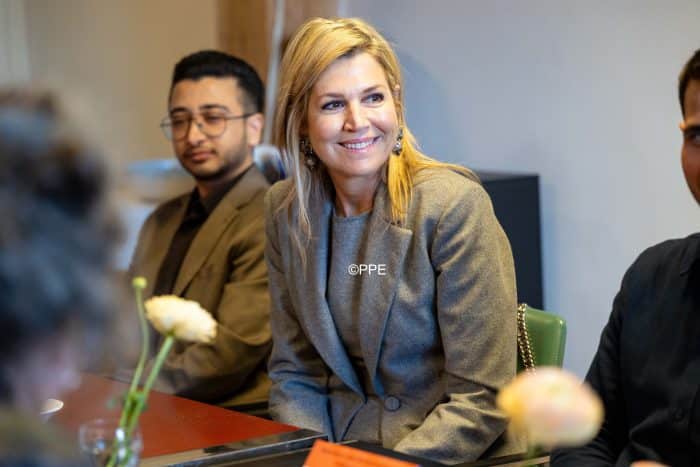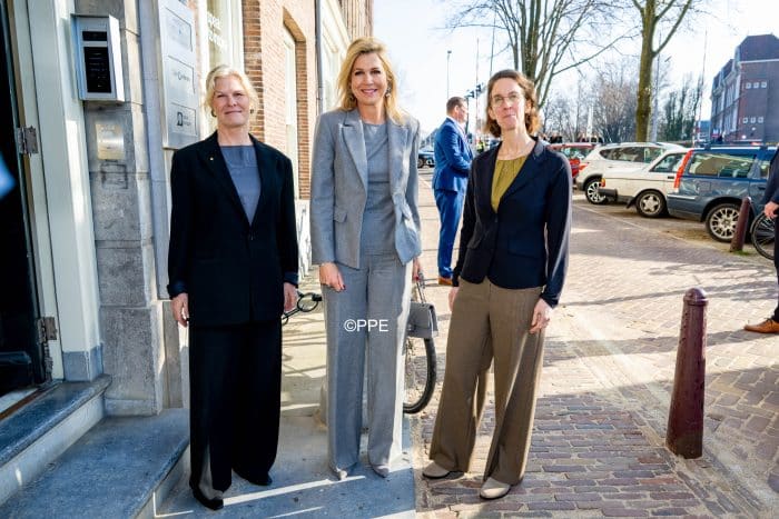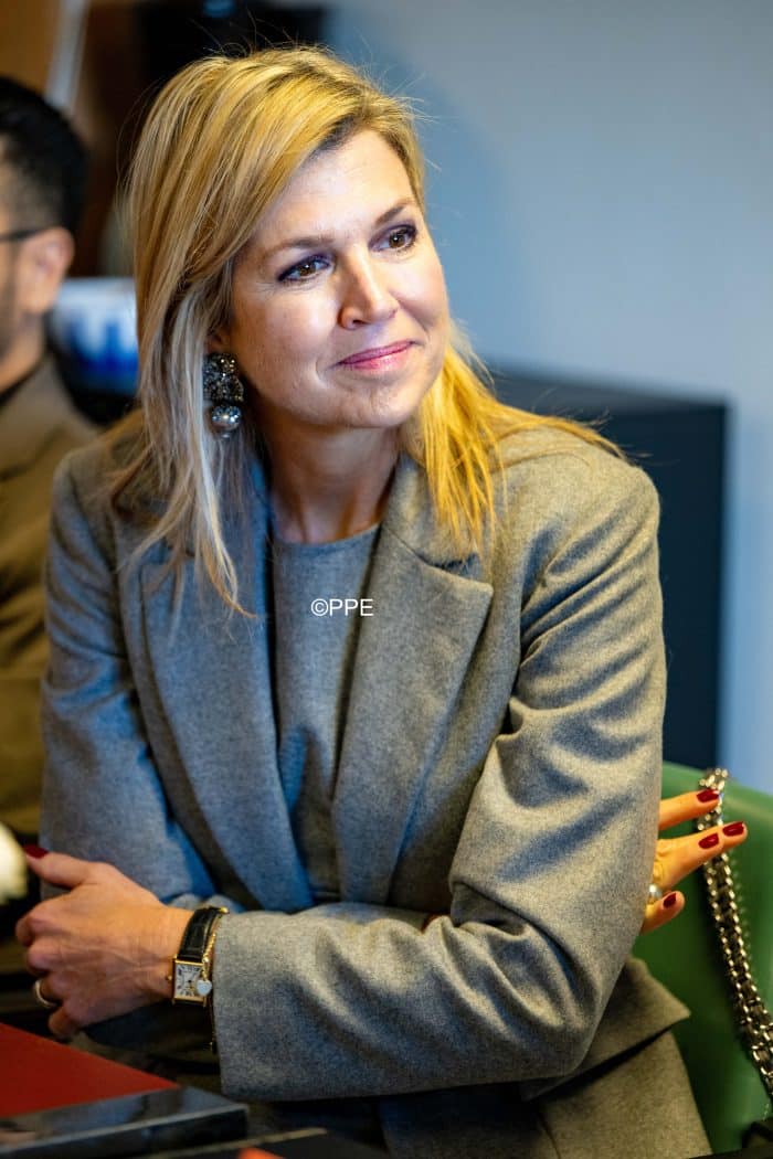 We zien koningin Máxima vandaag in een grijs broekpak van Modehuis Natan.
