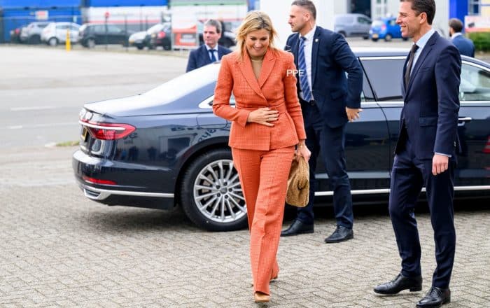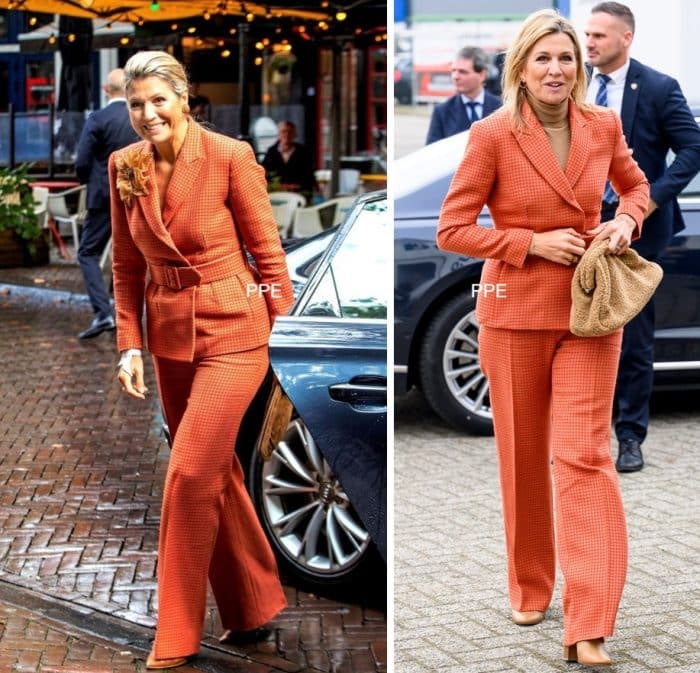 En dan toch nog even over het broekpak, want de styling ervan valt op. Voorheen droeg Máxima hem zónder zichtbare top en mét een grote broche. Vandaag kiest ze voor een zandkleurige top en dito accessoires, maar een broche ontbreekt. Welke styling spreekt jou meer aan?