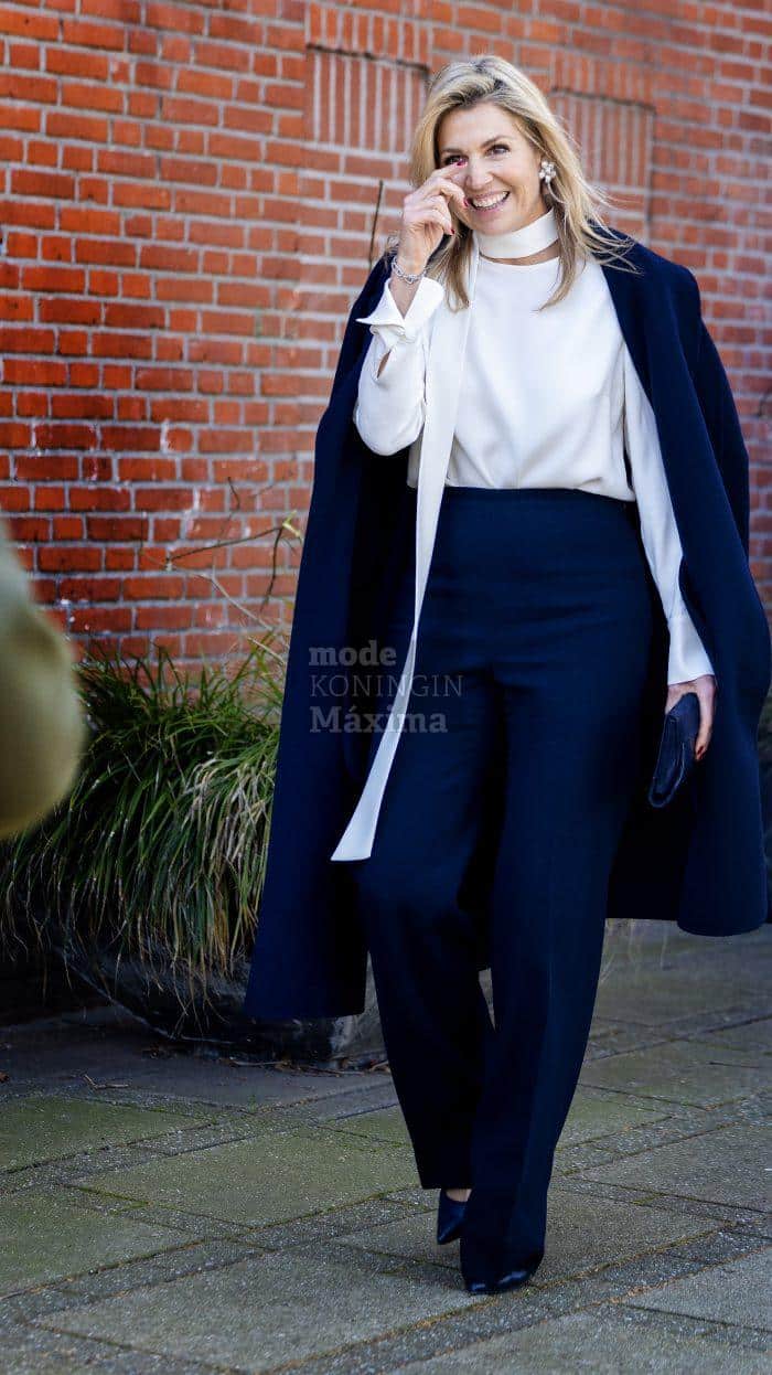 Koningin Máxima draagt een nieuwe witte blouse, een bijzonder ontwerp. De blouse op zich is vrij standaard, maar de manier waarop de sjaal om haar hals is gedrapeerd maakt het een specialer exemplaar. Máxima draagt de witte blouse op een donkere broek. Buiten zien we haar met een donkere mantel, die ze over haar schouders geslagen heeft.