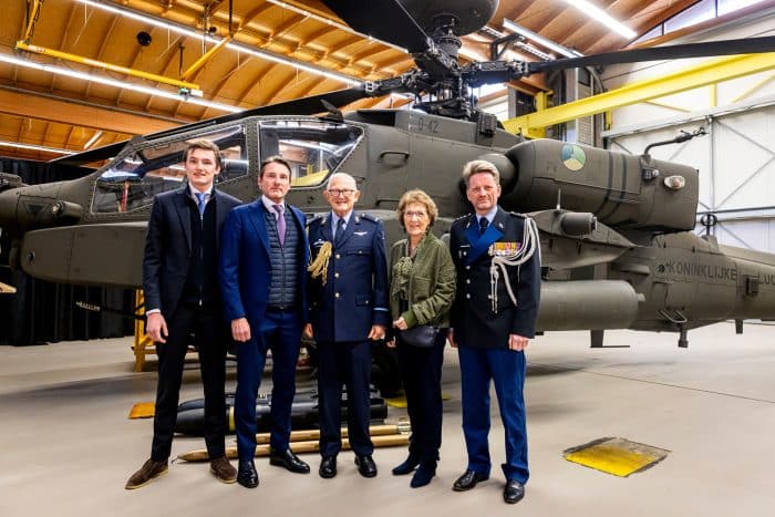 Prof. mr. Pieter van Vollenhoven bezocht deze week vliegbasis Gilze-Rijen, waar hij kennismaakt met het 301 squadron en uitleg krijgt over de Apache-E helikopter. Prinses Margriet, prins Maurits en zijn zoon Lukas en prins Pieter-Christiaan waren ook aanwezig. En dat heeft een reden! Pieter kreeg namelijk een nieuw officierskruis.