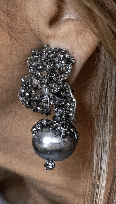 Qua oorbellen koos de koningin vandaag voor hangers van het Spaanse merk Dublos. Materialen: parel en strass.