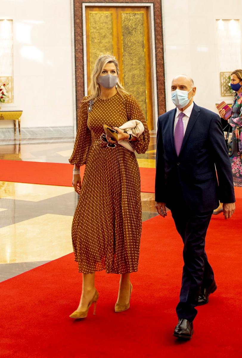 Voor de officiële ontmoeting op het vliegveld had Máxima een sjieke outfit tevoorschijn gehaald. Haar jurk met polkadots komt uit de collectie van Zimmermann en kennen we oa van het staatsbezoek aan Indonesië.