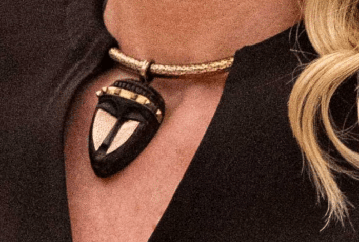 Hoe Valentino deze boodschap verwerkt heeft in stoffen en belijningen? De SS16-collectie bevat kralenpatronen van de Masai, opvallende pauwenmotieven en houten maskers. Een daarvan hangt om het gouden collier om Máxima’s hals, waaraan de jurk als het ware ophangt.