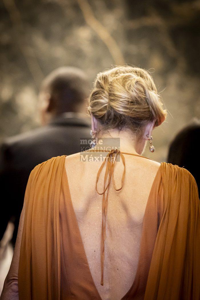 Een mooie jurk, niet persé voor gala, maar daar de koning ook in een normaal pak verschijnt toch passend. Best wel gewaagd, én een blote rug, én een diep decolleté én een split, maar ze kan het hebben. De prachtige bandeau vind ik bij deze japon too much, gouden indrukwekkende oorhangers en armband had ik beter gevonden.