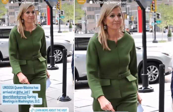 Na het veelbesproken bezoek aan Pennsylvania en Florida gaat het Amerikaanse avontuur gewoon nog even door voor de koningin. In Washington verscheen Máxima in een nieuwe, groene set bij de voorjaarsvergadering van IMF en de Wereldbank.