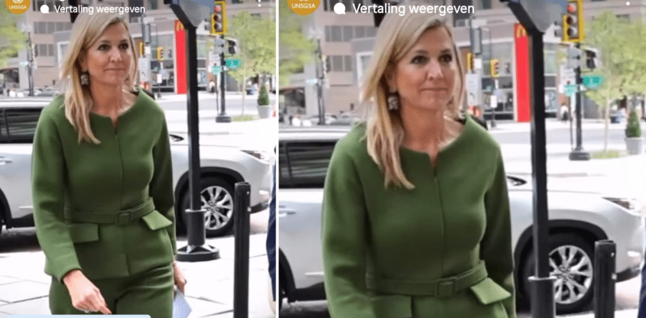 Máxima is blijkbaar in een groene mood, want voor de vierde keer deze week trok ze gisteren een groene set aan. Het jasje met een ronde hals, ceintuur en sierzakken + de bijpassende broek zijn nieuw en komen van modehuis Natan.