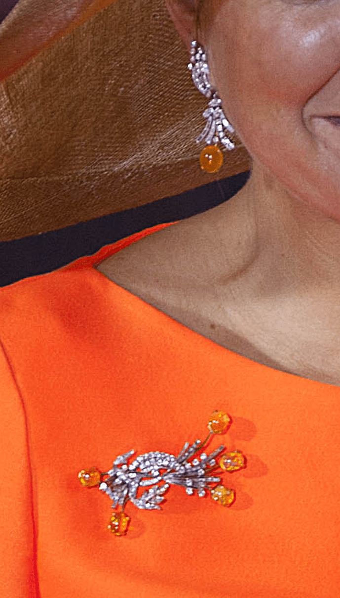 Qua juwelen viel de keuze op de set van diamant en vuuropaal, die de Oranjes naar verluidt cadeau kregen tijdens een bezoek aan Mexico in de jaren zestig. De oranje steensoort wordt daar namelijk veel gevonden. Rond de inhuldiging werd Máxima meermaals met de set gezien, die bestaat uit oorhangers, een broche en bijpassende armband. De laatste jaren verdwenen de juwelen steeds meer naar de achtergrond. Fijn dat ze weer zijn afgestoft!