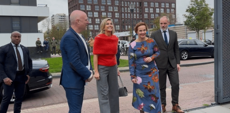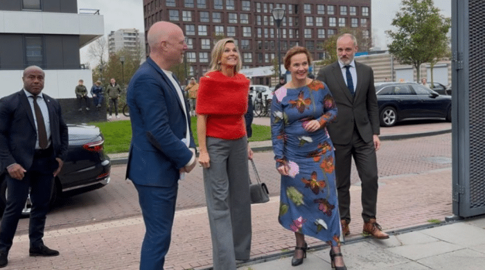 Voor een werkbezoek aan Mind Us in Haarlem trok Máxima vandaag een nieuwe outfit aan.