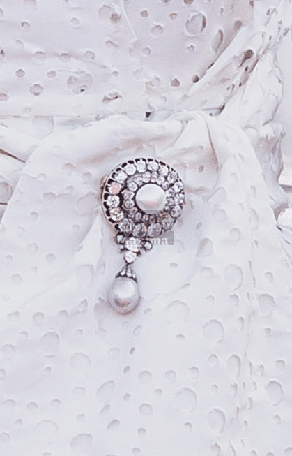 Deze prachtige parelbroche vind ik op de strikceintuur geen succes.