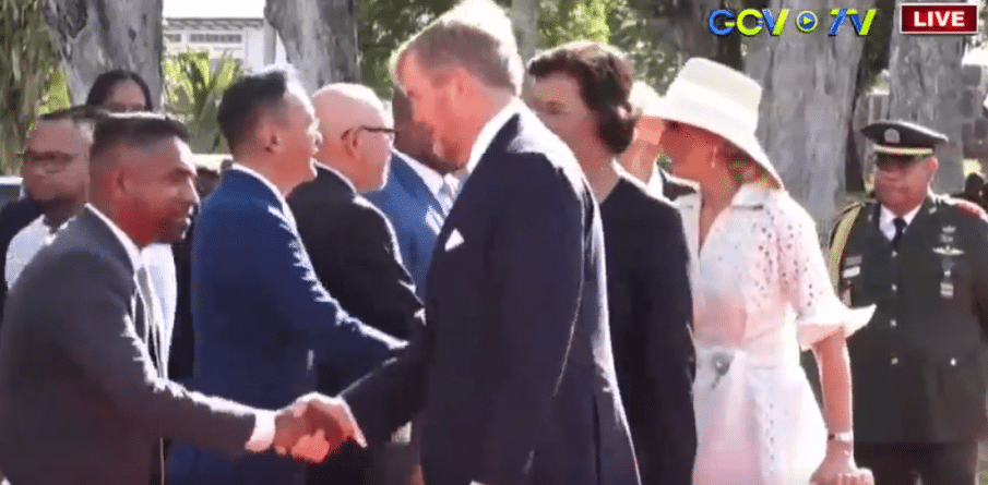 Het staatsbezoek aan Suriname is zojuist officieel begonnen met een welkomstceremonie. Koningin Máxima draagt een nieuwe jurk en een imposante broche.