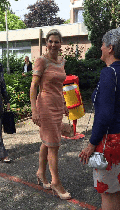 Wat een leuk jurkje, ik ben dol op oranje-achtige tinten en vooral als het niet zo knalt. Het is ook een kleur die maxima mooi staat, bij haar bruine ogen en teint. Schoenen goed, nagellak mooi, en de oorhangers gematigd van grootte, dat is fijn. Bij wat zij om haar armen schuift, denk ik vaak: less is more. Een fijn gouden armbandje volstaat en is echt mooi 🙂 De ring? een lelijk ding.