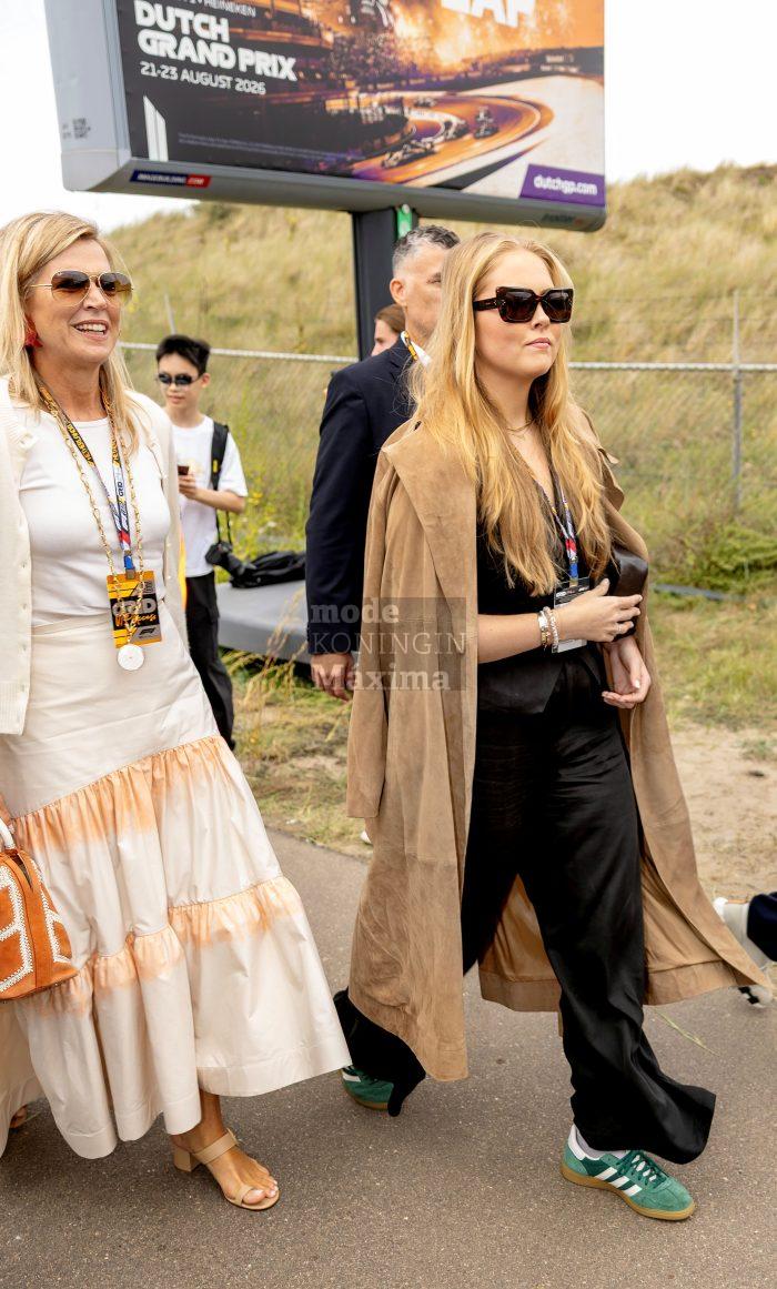 Passend bij het huidige modebeeld droeg prinses Amalia een gilet, wijde pantalon en sneakers van Adidas. De suede mantel komt uit Máxima’s kast.