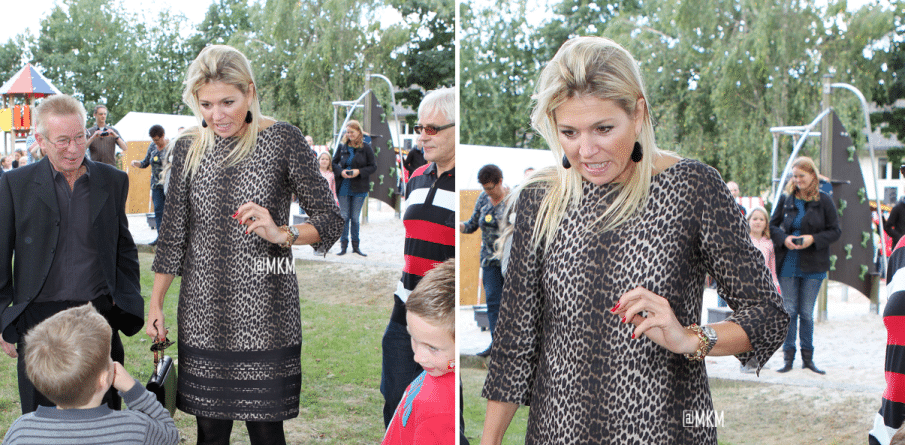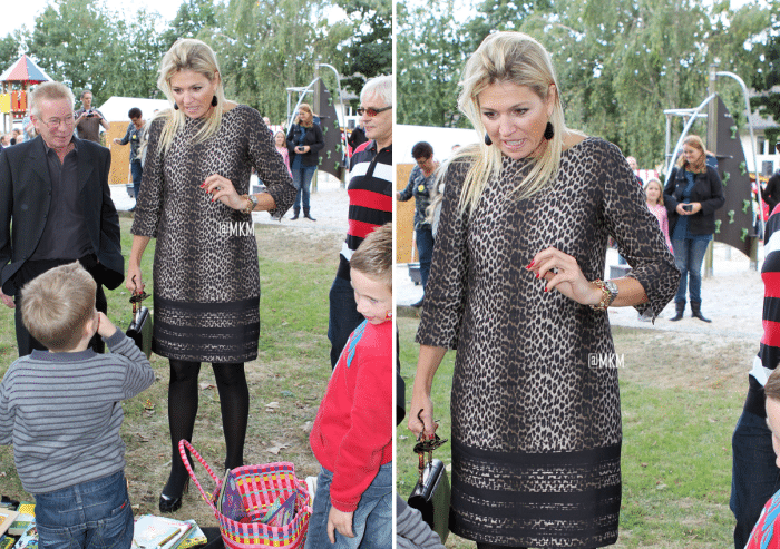 Met een dierenprintje begeef je je als royal op glad ijs. Ja, je look kan er heel hip en modern van worden, maar met een beetje pech – en vooral een verkeerde styling – kun je er ook uit komen te zien als het zusje van Nel Veerkamp. Toch durft Máxima het dessin aan. Met regelmatig verschijnt ze met een dierenprintje op de rode loper. Bijvoorbeeld in een panterjurk van modehuis Natan. Het kledingstuk debuteerde tijdens Burendag 2012 in Uden. Máxima combineerde hem toen met een zwarte maillot, leren peeptoes, zwarte oorbellen en haar vintage tasje van Susan Gail.