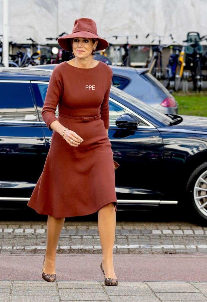 Een opening vraagt om het kledingvoorschrift tenue de ville + hoed. Máxima vulde dat vandaag in door haar roodbruine jurk van modehuis Natan te combineren met een vilten fedora van Fabienne Delvigne. Let ook even op de schoenen met dierenprintje. Ondanks de plateauzool vind ik de schoen wel goed matchen met de jurk. Geeft net wat meer pit.