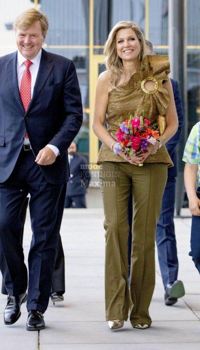 Ontzettend leuke top, en hij staat Maxima fantastisch. Deze pantalon heb ik er nooit mooi bij gevonden, dus goed idee om er een goudkleurige pantalon bij te dragen.