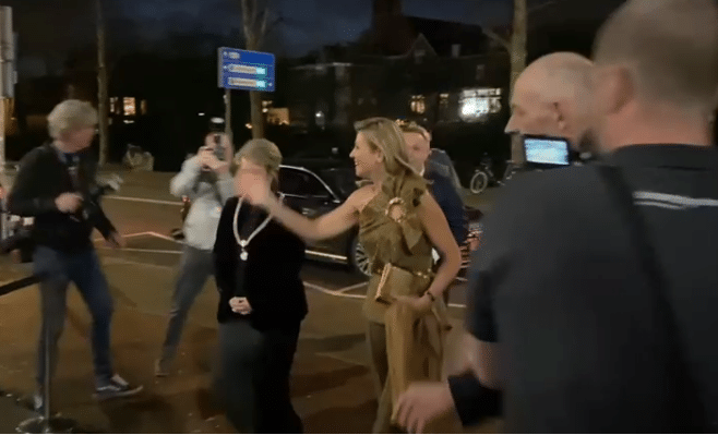 Ontzettend leuke top, en hij staat Maxima fantastisch. Deze pantalon heb ik er nooit mooi bij gevonden, dus goed idee om er een goudkleurige pantalon bij te dragen.
