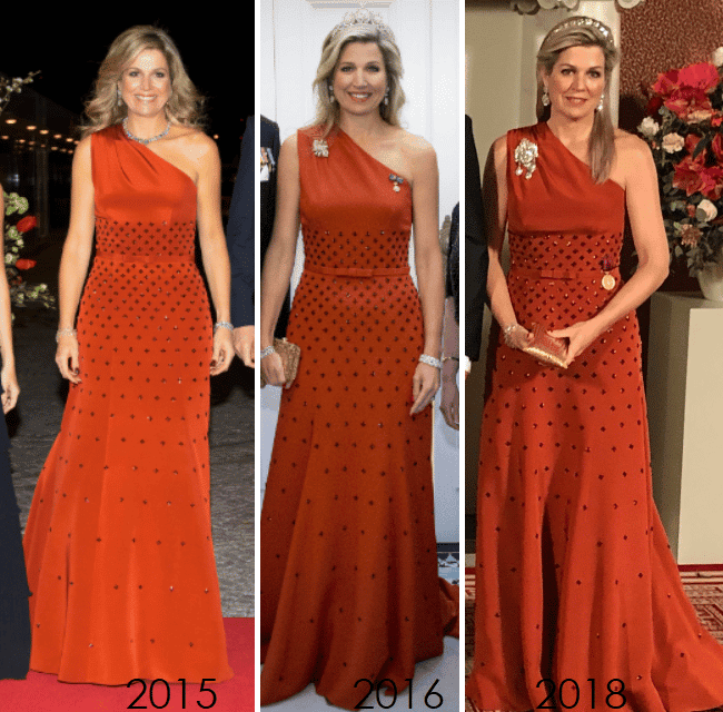 De jurk kwam drie keer eerder in beeld, iedere keer met andere juwelen. Helaas is de korte video van de RVD, waar wij een screenshot van gemaakt hebben, niet gescherp genoeg om uitsluitsel te kunnen geven over de broche van gisteravond.