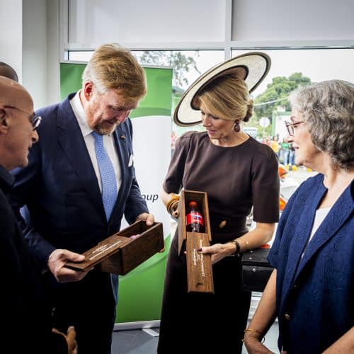 Máxima's robe manteau komt uit de Au79-collectie van Claes Iversen en is gemaakt van zijde en metal twill.De gouden ringen op de mouwen zijn geinspireerd op de gouden ringen die de vrouwen van de Ndebele stam in Afrika om hun nek dragen.