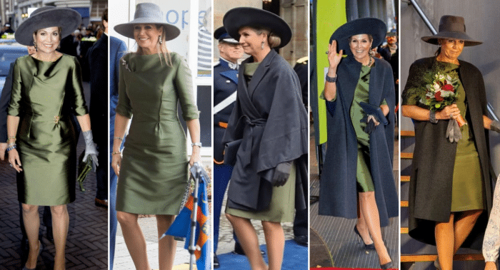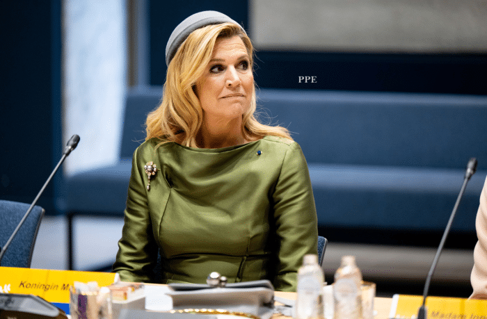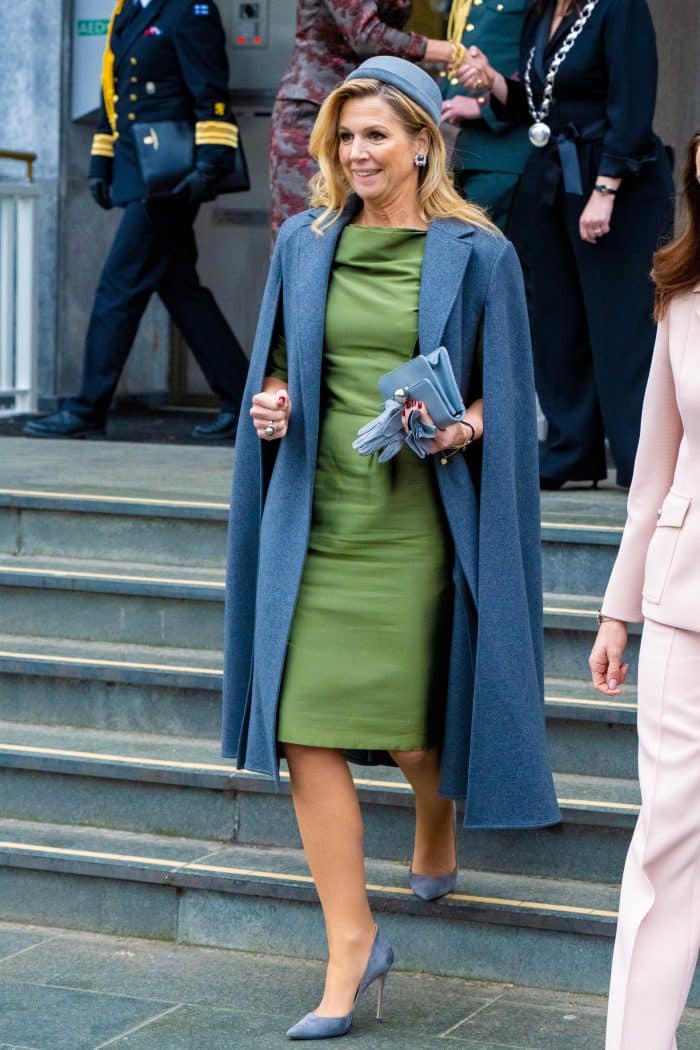 Een serieus thema vraagt om een serieuze, volwassen look. Máxima voelde dat goed aan en koos vanmorgen voor een olijfgroene jurk met decoratieve plooien van modehuis Natan.