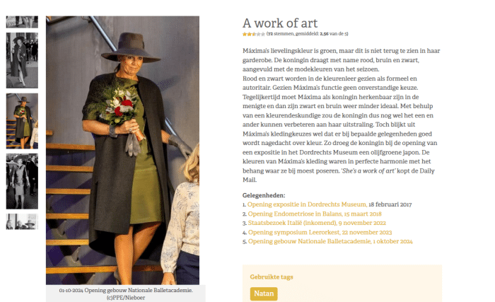In Máxima’s digitale kledingkast kun je de jurk ook sterren geven, waarbij 1 staat voor ‘niet mooi’ en 5 voor ‘prachtig’. Iedere stem wordt erg gewaardeerd, dus stem je mee?