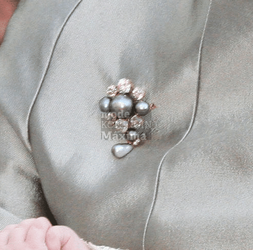 Op Máxima’s jurk prijkt een ronde broche met zes diamanten, vier grijze parels en een grijze parelpendant.