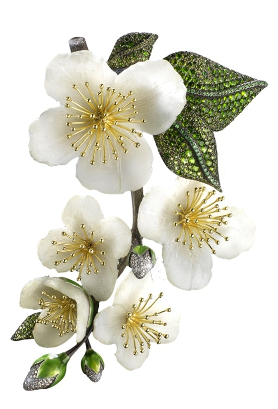 Tijdens het staatsbezoek van Portugal droeg de koningin ook een nieuwe broche, waar we alleen een héél kleine glimp van konden opvallen. Vandaag beleefde het juweel gelukkig zijn voorwaardige debuut. Het betreft de Philadelphus coronarius broche van Luz Camino. Deze alom bejubelde, Spaanse juwelenontwerpster weet met indrukwekkend veel precisie flora, fauna, smaken (waaronder popcorn), potloodslijpsel en meer te vangen in edelstenen en edelmetaal. Volgens Camino zit er meer schoonheid in de (alledaagse) dingen om ons heen dan we vaak zelf beseffen. Máxima’s broche is gemaakt van witte hars, emaille, diamanten, tsavorieten en chroomdiopsied (groene steensoort).