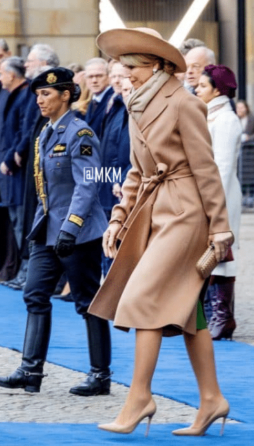 De outfit debuteerde tijdens het staatsbezoek van Portugal, december 2024. Destijds konden we er alleen een glimp van opvangen doordat er een winterjas overheen gedragen werd.