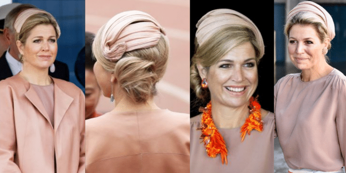 Máxima’s haardecoratie van bananenvezel en kraaltjes komt uit het atelier van Fabienne Delvigne. Sinds 2014 doet de accessoire dienst.