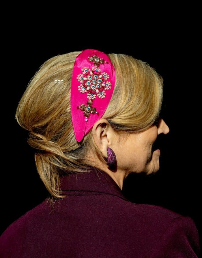 Wat een verschil die haarband met het opgestoken en goed gekapte haar! De haarband staat gelijk een stuk beter en volwassener. Zou de koningin een kapper thuis laten komen tegenwoordig, of doet Amaal het, of één van de zussen? 🤪 In ieder geval, ook zonder kunstlokken, doet Maxima opeens goed haar best tegenwoordig. Het tilt haar hele (dure) look gelijk naar een hoger level! Fijn om naar te kijken!